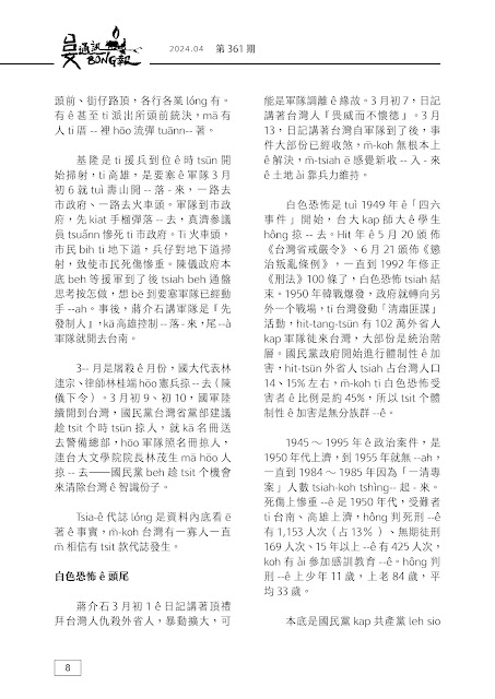 本底是國民黨kap共產黨leh sio刣,規个台灣人suah hōo絞絞--入-去。Hit个時tsūn hōo人屠殺--ê,m̄-nā是智識份子,真濟是技術工人kap農民、漁民,作家、軍警mā lóng有。尾--à,台獨案件愈來愈濟,1960年體制內改革ê案件有雷震案、1964年彭明敏師生ê〈台灣人民自救宣言〉、1961年ê蘇東啟案kap 1970年ê泰源事件,koh有「回溯匪嫌案」。