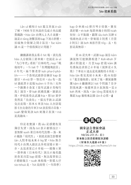 但是老實講,我iáu是感覺有淡薄仔失望,因為tsit款ê劇情設計,並無解sueh著日本時代流傳--落-來ê鐵路「現代性」,到底是按怎影響著lán人對幸福未來ê ǹg望,hōo無仝時代ê台灣人踏出去外地冒險ê第一步,去追求家己ê幸福——親像tī第一節車廂(日本時代)演出ê兩名戲班查某月雲kap碧霞,無法度替家己ê婚姻做主,suah來假做一對愛人仔sio-tshuā走。Tsit段南管〈一年四季〉kap仝車廂ná彈月琴ê唸歌,實在真好聽,m̄-koh每節車廂ê時間tsiah短短--à半點鐘,觀眾iáu-koh沉醉tī情緒內底ê時,穿柴屐ê阿勇(月雲ê阿兄)就beh來掠月雲tńg--去,有影是真無彩。